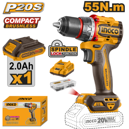 Ingco – Cordless Drill – Brushless – 55Nm 20V – 1 X 2.0Ah Battery