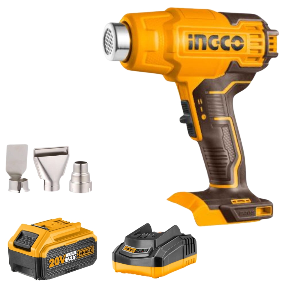 Ingco – Cordless Heat Gun 20V With 3 Nozzle With 4.0Ah Battery And Charger